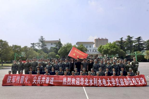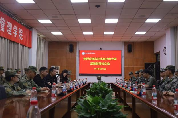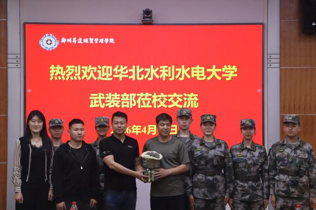2026年4月12日,华北水利水电大学人民武装部军事科科长王明磊、指导老师陈笑笑、王学亮带领华水新铁军骨干一行,走进郑州升达经贸管理学院,与该校尖兵连开展了一场内容充实、形式多样的调研学习活动。郑州升达经贸管理学院人民武装部副部长张志顺带领尖兵连作友好交流。