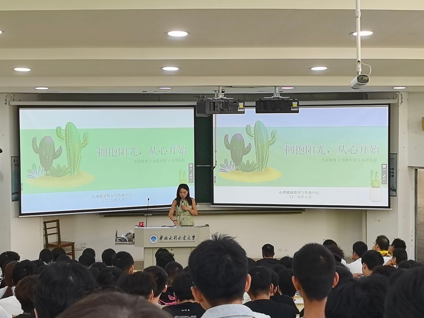 解析常见心理困扰时,史然老师聚焦新生环境适应、学业压力、人际关系等问题,结合案例讲解“新生适应综合征” 等困扰的表现与成因,缓解新生对心理问题的抵触。针对危机应对,她提出 “识别 — 接纳 — 调节 — 求助” 四步法,介绍 “情绪日记”“呼吸放松训练” 等调节方式,鼓励新生主动求助。生命教育环节,史然老师引导新生认识生命宝贵性,树立 “尊重生命、热爱生活” 的价值观,鼓励大家以积极心态面对挫折。