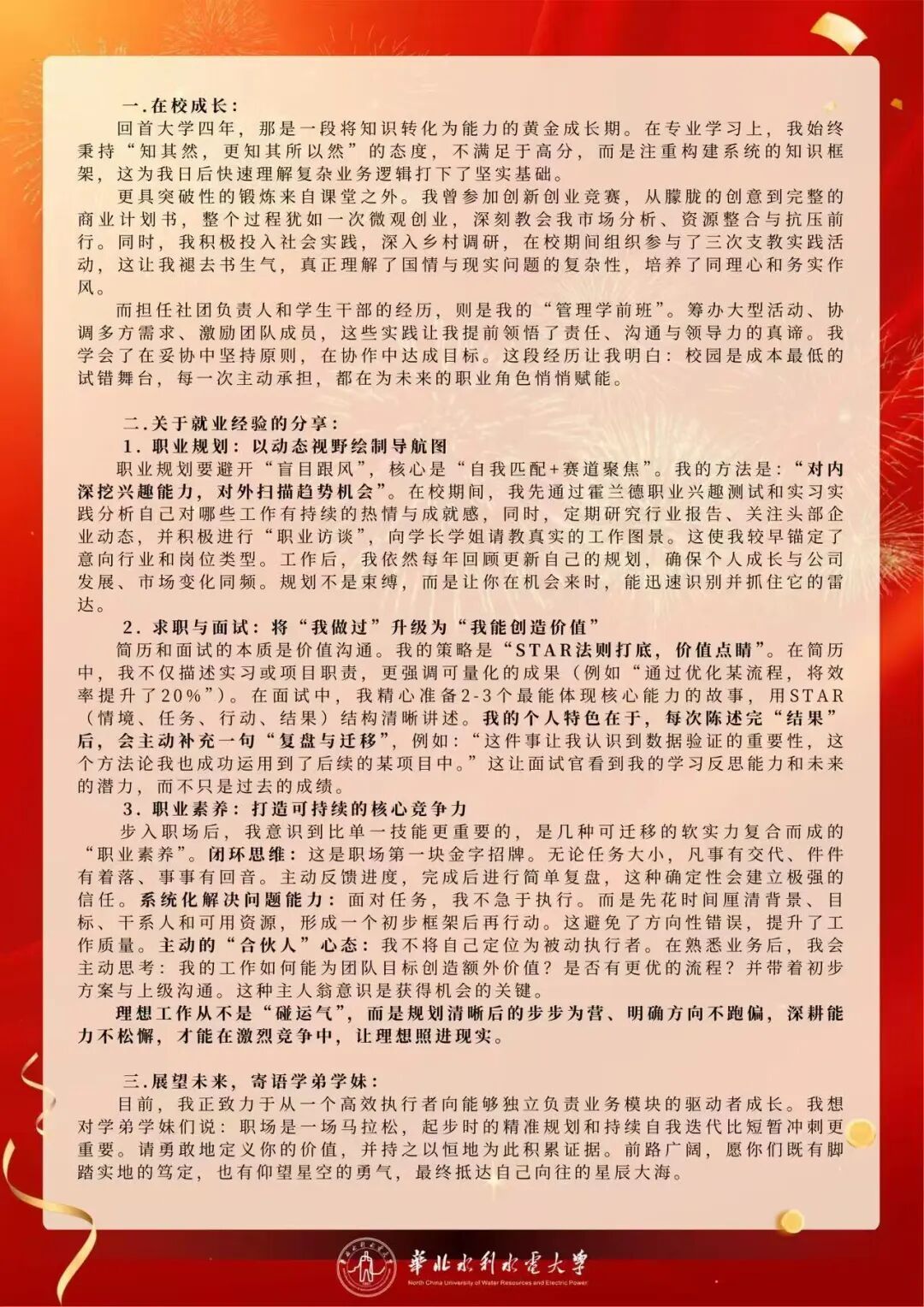 目前,我正致力于从一个高效执行者向能够独立负责业务模块的驱动者成长。我想对学弟学妹们说:职场是一场马拉松,起步时的精准规划和持续自我迭代比短暂冲刺更重要。请勇敢地定义你的价值,并持之以恒地为此积累证据。前路广阔,愿你们既有脚踏实地的笃定,也有仰望星空的勇气,最终抵达自己向往的星辰大海。