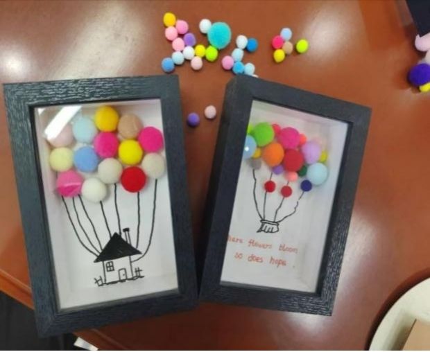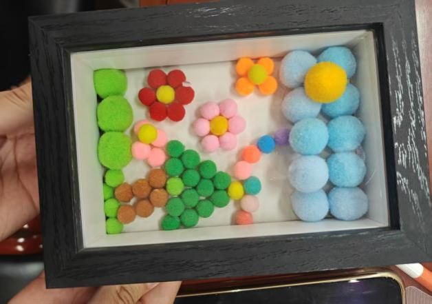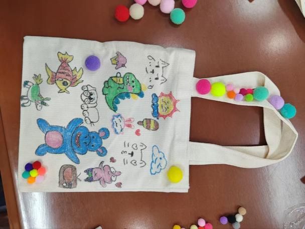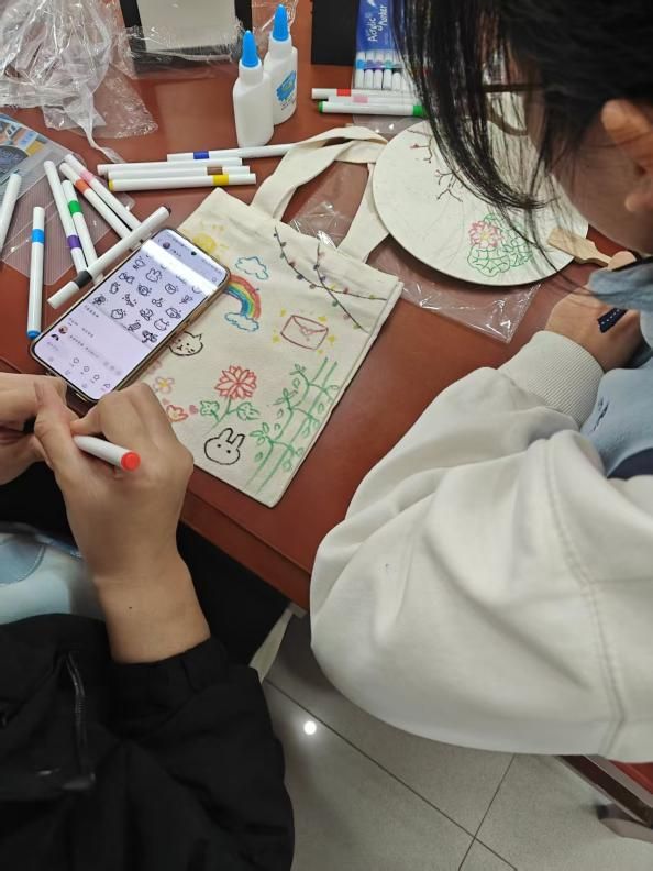 活动现场温馨而热烈,桌面上摆满了五颜六色的颜料、帆布包、毛线球、胶水、画笔等材料,宛如一个充满童趣与想象力的创意工坊。在专业指导与志愿者协助下,同学们首先在帆布包上自由绘画,用色彩表达当下的情绪状态。随后,大家利用柔软的毛球进行立体粘贴,创作出一个个独一无二的“情绪表情包”,或将焦虑“捏碎”成毛球堆,或将喜悦“粘成”笑脸挂饰,将抽象的情绪具象化、可视化,在创作中完成了一次温柔的自我对话。本次活动特别注重心理疏导与创意表达的结合。通过“色彩疗愈”与“触觉解压”双重路径,帮助学生在专注创作中暂时脱离学业焦虑,在互动交流中获得情感共鸣。