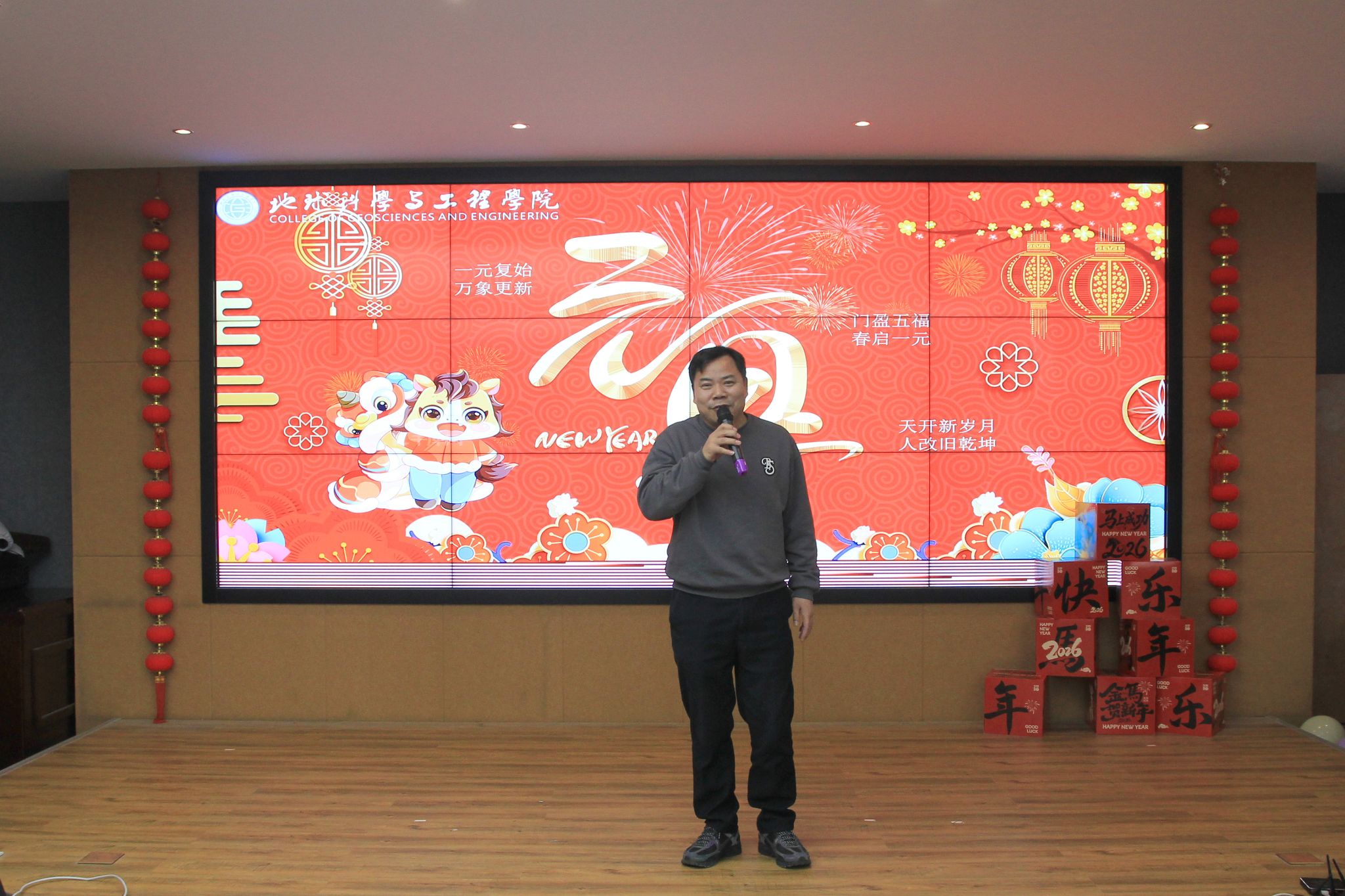 在热烈的掌声中,院长董金玉登台致辞。他代表学院向全体师生致以最诚挚的新年问候,对大家一年来的辛勤付出表示衷心感谢。他指出,过去一年,在全体师生的凝心聚力、并肩奋斗下,学院在教学科研、人才培养、学科建设等多个领域取得了长足进步与突破性成果,每一项成绩的背后都凝聚着大家的智慧与汗水。随后,他送上美好祝愿,愿老师们在新的一年里工作顺遂、事业精进,家庭幸福美满、身体健康无恙。最后,董院长寄语全体在场人员,希望大家暂时卸下忙碌,尽情享受联欢会的欢乐时光,在欢声笑语中感受大家庭的温暖。
