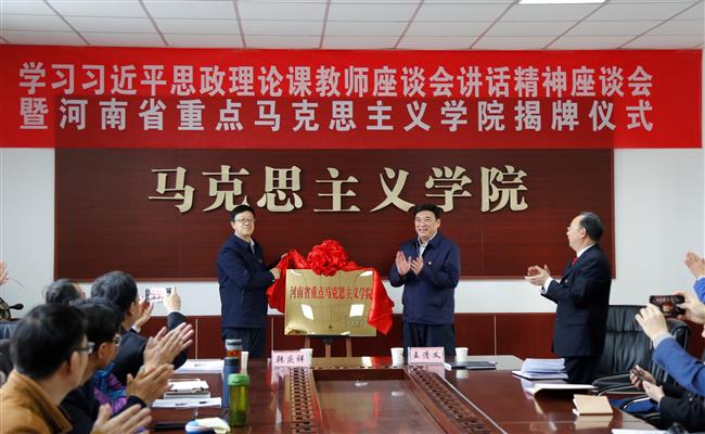近日,省委宣传部、省委高校工委、省教育厅发文,我校马克思主义学院被批准为河南省首批重点马克思主义学院。4月3日上午,学校在马克思主义学院会议室举行学习习近平思想政治理论课教师座谈会讲话精神座谈会暨河南省重点马克思主义学院揭牌仪式。校党委书记王清义、党委副书记马书臣,学校特聘教授韩庆祥,党委统战部、教务处、人事处、社科处、研究生院、团委等部门负责同志,马克思主义学院领导班子及教师和学生代表等参加活动。王清义和韩庆祥共同为河南省重点马克思主义学院揭牌。