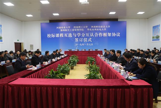 为充分发挥各高校在人才培养等方面的优势特色,促进优质教育教学资源开放共享,1月7日上午,华北水利水电大学牵头与河南农业大学、河南理工大学、河南财经政法大学、郑州航空工业管理学院在华水第四会议室签署了课程互选与学分互认合作框架协议,在河南省率先实行校际课程互选与学分互认。河南省教育厅副厅长刁玉华出席会议并讲话。河南省教育厅高教处处长唐多毅,华北水利水电大学党委书记王清义、校长刘文锴、副校长王天泽,以及其他四所高校的校领导、有关职能部门负责同志等参加了活动。王天泽主持仪式。