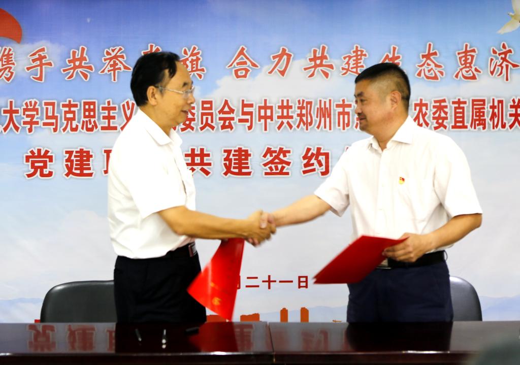 马克思主义学院院长饶明奇、惠济区农委直属机关党委书记、农委主任李瑞代表双方签订党建联建共建协议书