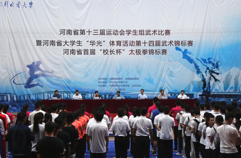 7月11日上午,由河南省教育厅与河南省体育局联合主办,我校承办的河南省第十三届运动会学生组武术比赛暨河南省大学生“华光”体育活动第十四届武术锦标赛,河南省首届高校“校长杯”太极拳锦标赛,河南省首届中、小学学生武术锦标赛,河南省首届国际留学生武术锦标赛在我校花园校区文体活动中心拉开帷幕。副校长王天泽出席开幕式并致欢迎辞,河南省体育总会副主席、武术协会主席卫中玲,河南省学生体育总会副主席兼秘书长崔伟,河南省武术运动管理中心主任马延春,体育教学部党总支书记徐震,本次比赛总裁判长杜金山出席开幕式。河南省学生体育总会、武术协会秘书长马明主持开幕式。