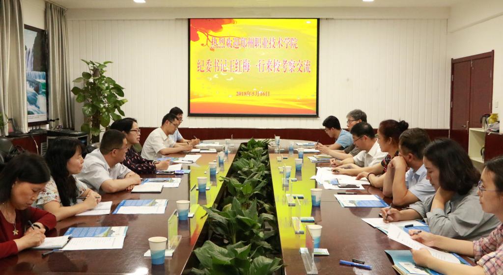 许科红对王红梅书记一行表示热烈欢迎,介绍了学校的发展历程和基本概况。王红梅介绍了郑州职业技术学院基本情况和来访目的。双方就采购招投标管理监督、新校区建设监督、老校区改造维修、食堂经营管理等工作进行了深入交流。双方表示,要以此次考察交流为契机,进一步加强交流,增进友谊,取长补短,共同提高。