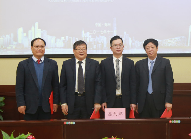 联合国教科文组织水环境学院授权代表黄河水利委员会国际合作与科技局局长尚宏琦、台湾大学国际水利环境学院院长李鸿源教授、黄河勘测规划设计有限公司董事长张金良教高、华北水利水电大学副校长刘汉东教授分别代表合作单位签订了可持续发展联合研究中心合作协议。
