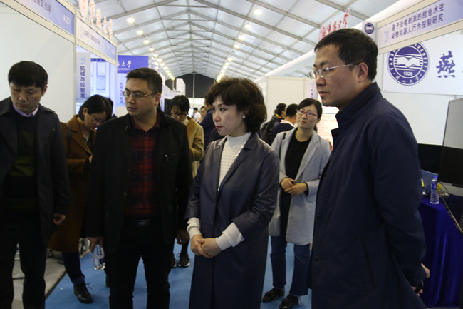 校党委副书记高京燕等与参赛师生在项目展位前合影