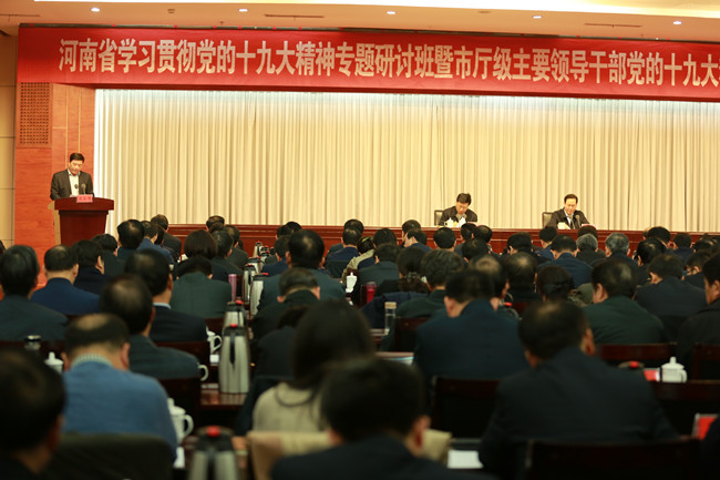 11月17日至21日,全省学习贯彻党的十九大精神专题研讨班暨市厅级主要领导干部党的十九大精神轮训班在河南省委党校举行,省委书记、省人大常委会主任谢伏瞻出席开班式并作题为“沿着习近平新时代中国特色社会主义思想指引的方向奋勇前进谱写中原更加出彩新篇章”的专题辅导报告,省长陈润儿以及国内知名专家学者分别作专题辅导报告,省委副书记王炯总结讲话。省辖市市委书记、市长,省直机关正厅级领导干部,省管企业和高等院校主要负责同志,县(市)委书记参加了本次专题研讨班。我校党委书记王清义、校长刘文锴参加了本次研讨班。王清义作为高校唯一代表在11月21日的结业仪式上作了《新思想引领新时代新时代要有新作为》的主题发言。