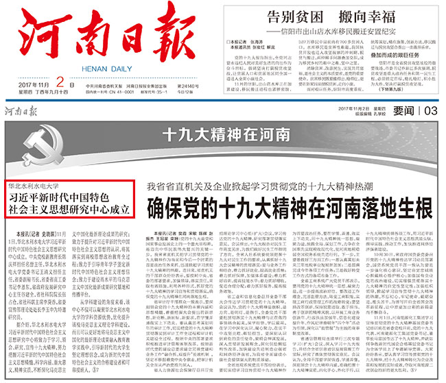 11月1日,华北水利水电大学习近平新时代中国特色社会主义思想研究中心成立。中央党校副教育长韩庆祥担任名誉主任,华北水利水电大学党委书记王清义担任主任,省委副秘书长、省委省直工委书记李恩东,省政府发展研究中心主任谷建全,省社科院院长张占仓,省社科联主席李庚香,省委宣传部理论处处长李玉中为特邀研究员。