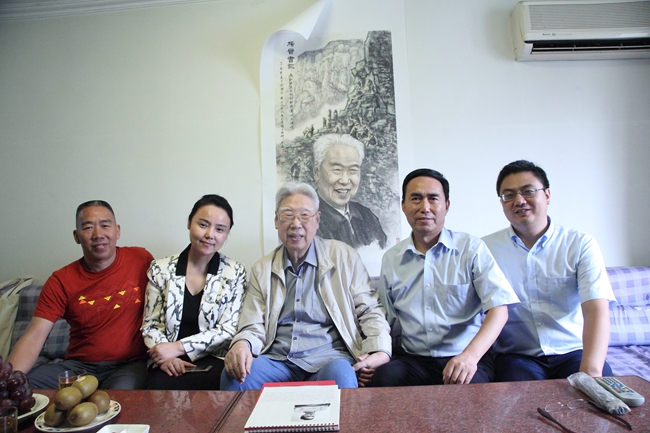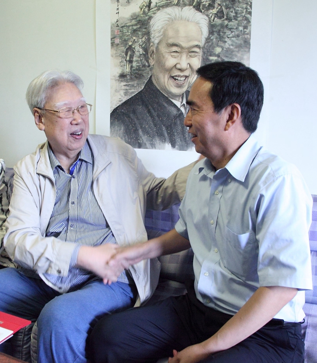 7月26日,华北水利水电大学党委副书记石品一行冒雨来到红旗渠总设计师、时任林县县委书记杨贵北京的家中拜望,向他表示崇高的敬意和诚挚的祝福,代表学校向老书记赠送石品教授创作的国画作品《杨贵书记》。