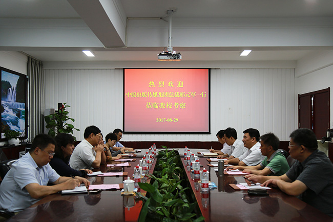 8月29日下午,中原出版传媒集团总裁郭元军、副总裁马雪一行6人莅临我校考察、交流。在龙子湖校区第三会议室,校党委书记王清义会见了来宾,副校长王天泽及党委办公室、图书馆有关负责人参加了座谈交流。双方就贯彻落实由中共河南省委宣传部、河南省精神文明建设指导委员会办公室、河南省教育厅等部门联合颁布的《河南省“实体书店进校园”三年行动计划》(豫宣通【2017】56号)展开了广泛交流并取得一致意见。