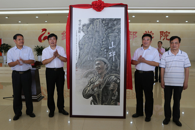 我校党委书记王清义、校长刘文锴代表学校向红旗渠干部学院赠送了《杨贵书记》和《红旗渠劳模任羊成》两幅画作。这两幅中国画作品由我校党委副书记、国家一级美术师石品教授创作,塑造了红旗渠英雄杨贵书记和红旗渠劳模任羊成的英模形象。在捐赠仪式上,石品介绍了两幅画作的创作心态、创作经历和创作意义。杨贵老书记是红旗渠的总设计师,从勘察、设计到施工,时任县委书记杨贵是红旗渠建设的最直接领导者和组织者,在红旗渠建设中创下了丰功伟绩。任羊成是红旗渠建设中的除险队长,他终日带领队员腰系大绳,冒着生命危险,飞崖下崭,凌空除险,扫除障碍,被群众誉为“飞虎神鹰”。杨贵老书记、任羊成老英雄都是红旗渠建设者的突出代表,是体现红旗渠精神的英雄模范代表。正是满怀对红旗渠精神的敬仰和对红旗渠建设者们的敬意,石品以一名画家的责任和担当,拿起画笔,饱含激情,为这两位英雄模范人物塑像。