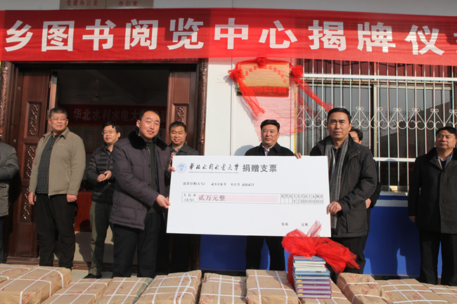 校党委副书记石品等代表我校向当地捐赠价值15万元的图书和2万元现金支票