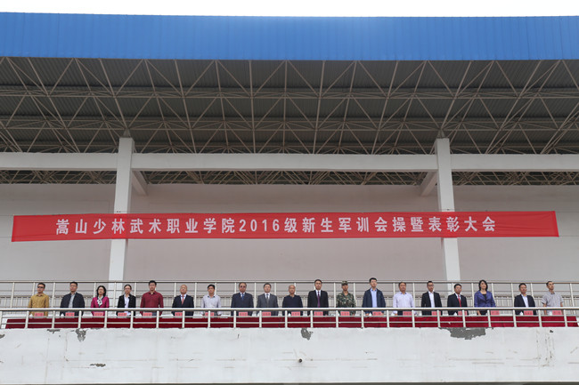 开学典礼开始前,校领导与嵩山少林武术职业学院有关领导共同观看了新生军训会操汇报表演,并向军训先进集体和先进个人进行颁奖。