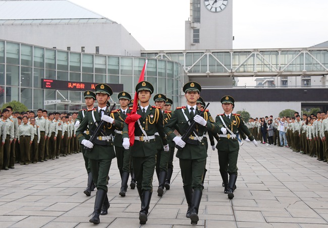 校国旗护卫队成员迈着铿锵有力的步伐走向国旗台