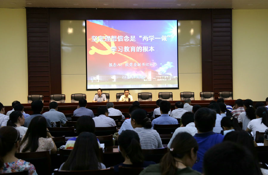 校党委副书记石品以《坚定理想信念是“两学一做”学习教育的根本》为题,从“理想信念”、“两学一做”的内涵讲起,深刻阐述了三个主要问题。一是坚定理想信念是“两学一做”学习教育要解决的根本问题。坚定的理想信念,历来是共产党员的立身之本,动力之源。无论是革命战争年代还是社会主义建设时期,我们党所取得的一切成就,以及涌现出的一批批优秀党组织和优秀党员典型,都与始终坚持理想信念密不可分。当前,少数党员干部对党的信念有所动摇、逐渐弱化,究其根本原因,与党员理想信念的缺失有关。“两学一做”学习教育是深化党内教育的又一次重要实践,更是推动党内教育从“关键少数”向广大党员拓展、从集中性教育向经常性教育延伸的重要举措,最终目的就是要通过学习教育解决党员干部理想信念是否缺失和坚定的问题。二是要把理想信念教育贯穿“两学一做”学习教育始终。“没有理论的人容易被‘俘虏’”。坚定的理想信念,是每个党员干部终身的必修课。要让每一位党员通过学习党章党规党纪和系列讲话精神,明白作为一名共产党员,首要的就是坚定理想信念,坚守共产党人的精神追求。要通过学习深入思考入党为什么、党员图什么、为党做什么,做到真学、真懂、真信、真用,把学习成效转化为坚持共产主义远大理想和中国特色社会主义共同理想的坚定信念,转化为与人民群众同呼吸、共命运、心连心的真挚情感,增强贯彻党的理论路线方针政策的自觉性和坚定性,增强为党和人民事业不懈奋斗的自觉性和坚定性。三是要把坚定理想信念教育作为一项重要工作长抓不懈。党员干部理想信念教育的确立和巩固不是朝夕可以完成的,要探索加强党员干部理想信念教育的途径,增强党员干部理想信念教育的有效性和长期性,就必须:加强理论学习,在夯实理想信念教育的思想基础上下功夫;注重实践培养,在打牢理想信念教育的实践根基上下功夫;创新方法途径,在增强理想信念教育的实效性上下功夫;建章立制,在建立理想信念教育长效机制上下功夫;提升教育者的素质,在增强理想信念教育的质量上下功夫。石品副书记的报告旁征博引、案例典型、深入浅出,与会人员深受教育、启迪和鼓舞。