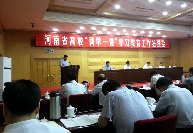 7月7日上午,为总结我省高等学校“两学一做”学习教育进展情况,交流经验做法,查找问题不足,推动下一步工作,确保学习教育深入扎实开展,河南省高校“两学一做”学习教育工作推进会在郑州举行。省委组织部副部长朱是西主持会议,省委高校工委书记、省教育厅厅长朱清孟出席会议并讲话。郑州大学、河南大学、华北水利水电大学等五所高校作为代表发言。我校党委书记王清义以《突出特色 扎实开展 以“五个结合”为统领把学习教育引向深入》为题,从三个方面介绍了我校开展“两学一做”学习教育的基本情况。一是以上率下,形成浓厚学习氛围。二是选树典型,发挥引领和激励作用。三是以实效为统领,坚持“学”、“讲”、“树”、“做”、“改”、“促”、“评”有机融合。