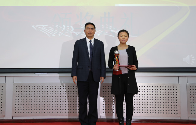 校党委副书记石品为一等奖获得者单洁洁同学颁奖