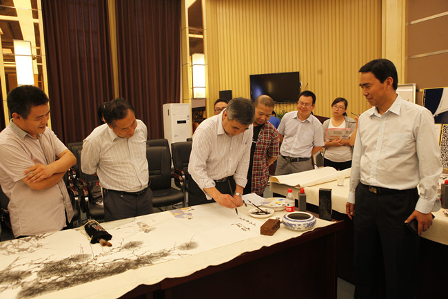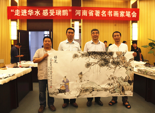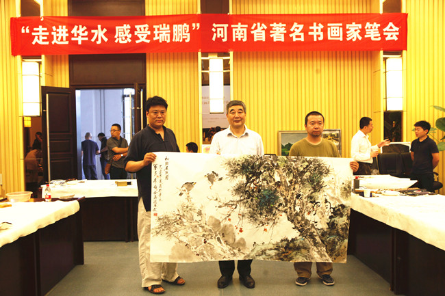 6月25日下午三点,河南省文联副主席、河南省美术家协会副主席兼秘书长刘杰,河南省美术家协会副主席、河南省书画院院长谢冰毅,河南省书法家协会副主席、河南省书法院院长李强,河南省美术家协会副主席、河南省书画院副院长李明以及画家桂行创、连俊州、郭建明、李尚昱、张军民、刘席伯,书法家张永刚、娄红卫、丁林、陆跃天,书画评论家郑志刚等,这些享誉美术界的著名艺术家齐聚华水新校区,应邀来参加由河南省美术家协会、河南省书画院、华北水利水电大学艺术与设计学院共同组织的“走进华水,感受瑞鹏”河南省著名书画家笔会,一时间第四报告厅高朋满座,热闹异常。这些深受书画爱好者喜爱,作品社会价值、经济价值都不可小觑的艺术大家们百忙中集体来我校参加笔会,这是落实省委宣传部、省文联提出的文艺界要做好舍己救人优秀大学生孟瑞鹏宣传工作要求的又一个重要举措。我校原党委书记朱海风,党委副书记、艺术与设计学院院长石品及我校马勇、武金勇等画家出席了笔会。我校有关职能部门负责人、艺术与设计学院师生代表和学生社团书画爱好者以及自发慕名而来的众多师生代表共同观摹了笔会。
