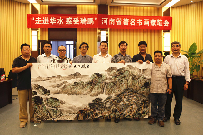 书画家们在《丰采瑞鹏》前合影