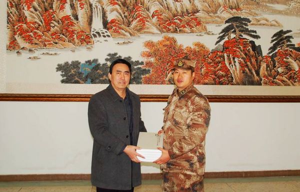 校党委副书记石品向部队官兵赠送自己印制的个人作品集