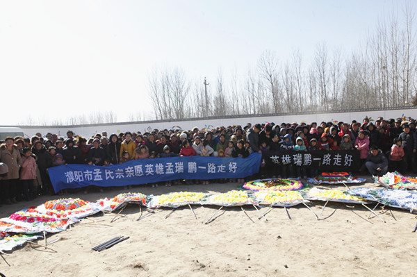 仪式开始前,校党委书记朱海风等来到瑞鹏同学父母前,与他们一一握手,请他们节哀、保重,并再次送上慰问金。期间,朱书记几度哽咽,泪水夺眶而出,现场师生也默默流下了悲痛的泪水。河南省见义勇为基金会秘书长郑献春,濮阳市副市长王天阳,市政府党组成员、市公安局局长李军信、濮阳市委宣传部常务副部长都国林、共青团濮阳市委书记刘兵以及其他市直单位领导,清丰县县委书记鲁彦峰、县长冯向军、副书记刘万英、政法委书记惠晓杰,县委办公室主任戚士杰、宣传部长李志华等县乡领导出席了告别仪式。从全国各地赶来的孟瑞鹏生前的同学、好友,临近各乡村的村民以及媒体朋友等上千人也自发前来为他送行。