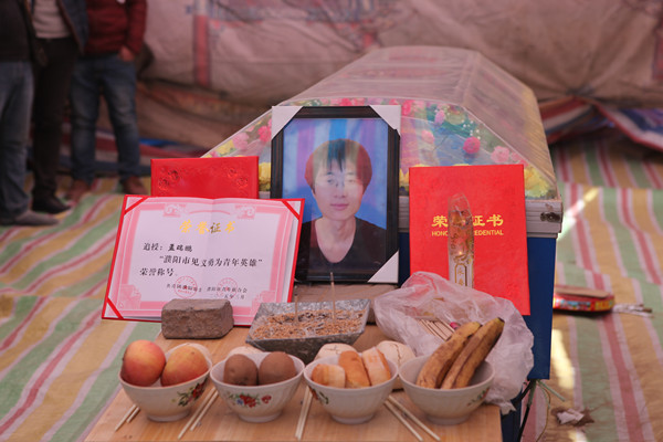 摆放着孟瑞鹏同学遗像和荣誉证书的灵柩