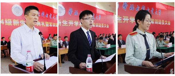 教师代表杨国斌教授发言,阐述了他对大学的感悟和心得,同时向同学们提出了殷勤的希望和期盼。在校生代表、数学与信息科学学院李泽同学,新生代表、电力学院姜冰倩同学在会上发言。
