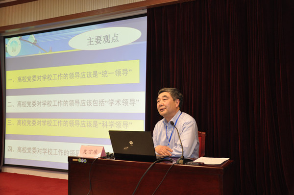 我校党委书记朱海风教授在平行论坛上围绕“提高高校党委领导科学化水平”做了专题报告。他认为,着力提高高校党委领导科学化水平,是贯彻落实党的十八大“以改革创新精神全面推进党的建设新的伟大工程,全面提高党的建设科学化水平”的重要体现。高校的领导体制是党委领导下的校长负责制,“高校党委领导科学化水平”问题,不是该不该提高的问题,而是怎样提高的问题。他认为,当前有三个问题需要强调:一是高校党委对学校工作的领导应该是“统一领导”。高校党委“统一领导学校工作”,决定了党委领导不仅仅是思想领导、政治领导和组织领导,而且还包括对学术工作的领导。这不是什么权力的大小多少问题,而是法定的职责、使命、义务问题。二是高校党委对学校工作的领导应该是“集体领导”,即集体领导与个人分工负责相结合的领导、与校长负责制相结合的领导。三是高校党委对学校工作的领导应该是“科学领导”。科学领导的实质就是“遵循规律、办好学校”的领导 ,即自觉按照高等教育规律(学术发展规律)、领导规律和党建规律办学兴校的领导。朱书记的报告观点新颖、视角独到、论证缜密,受到与会代表的普遍关注和一致好评。