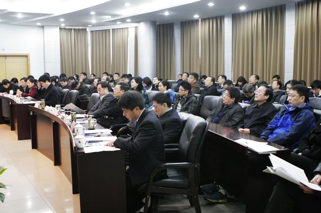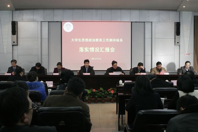党委书记朱海风主持汇报会,校长严大考致欢迎辞,党委副书记石品代表学校作了题为《全面落实〈测评体系〉,不断开创我校大学生思想政治教育工作新局面》的汇报发言。