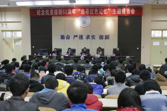 11月10日下午,由我校关工委和校团委共同举办的纪念抗美援朝63周年“追寻红色记忆”主题报告会在龙子湖校区第二报告厅举行。校党委副书记石品出席会议并致辞。抗美援朝老战士、战友团团长贺兴栋、抗美援朝精神宣讲团名誉会长李志萍以及十位抗美援朝老英雄出席了报告会。校团委书记李尚可主持报告会。校关工委副主任孙绪金、党委宣传部副部长宋刚福、党委学工部副部长李胜机、校团委副书记宋凯果等与三百余名学生干部代表共同聆听了报告。