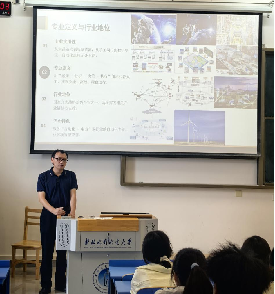 自动化系主任顾波教授生动阐释了自动化专业的广阔前景。他指出,自动化是以控制论、系统论、信息论为基础,涉及人工智能、机器人、智能制造等前沿领域的综合性学科。专业特色在于“控(制)管(理)结合,强(电)弱(电)并重,软(件)硬(件)兼施”,致力于培养能够设计、开发和应用自动化系统的卓越创新人才。他希望新生们能培养系统思维,拥抱智能化浪潮,在智能制造、智慧能源、无人系统、智慧城市等关键领域推动产业智能化升级与社会变革。