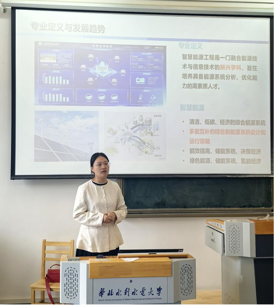 智慧能源专业作为面向国家“双碳”战略需求的前沿交叉学科专业,由专业负责人陈露露副教授进行介绍。她指出,该专业依托学校电气工程等省级重点学科及多个一流本科专业建设平台,深度融合能源技术与信息技术,构建了“能源-电气-信息-控制”的复合培养体系,重点聚焦智慧综合能源系统与能源低碳转型等方向。她充满激情地鼓励新生们投身这一充满挑战与机遇的领域,为构建绿色、可持续的能源未来贡献智慧。