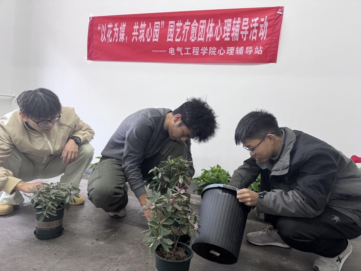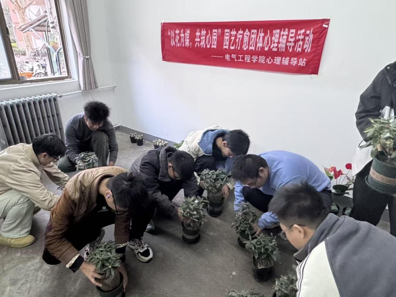 电气工程学院心理辅导站于2025年11月21日在校园成功举办“以花为媒,共筑心园”园艺疗愈团体心理辅导活动。活动现场设置花苗培育、盆栽修剪、绿植命名三个核心环节,参与者们领取花苗、花土、花盆后,在指导下开启与植物的深度互动。大家专注于翻土、定植、塑形,为亲手培育的绿植赋予专属名字与美好寓意,在草木清香中,让紧绷的身心逐渐舒缓,有效释放了学业与生活中的压力,收获了一段治愈且充实的时光。