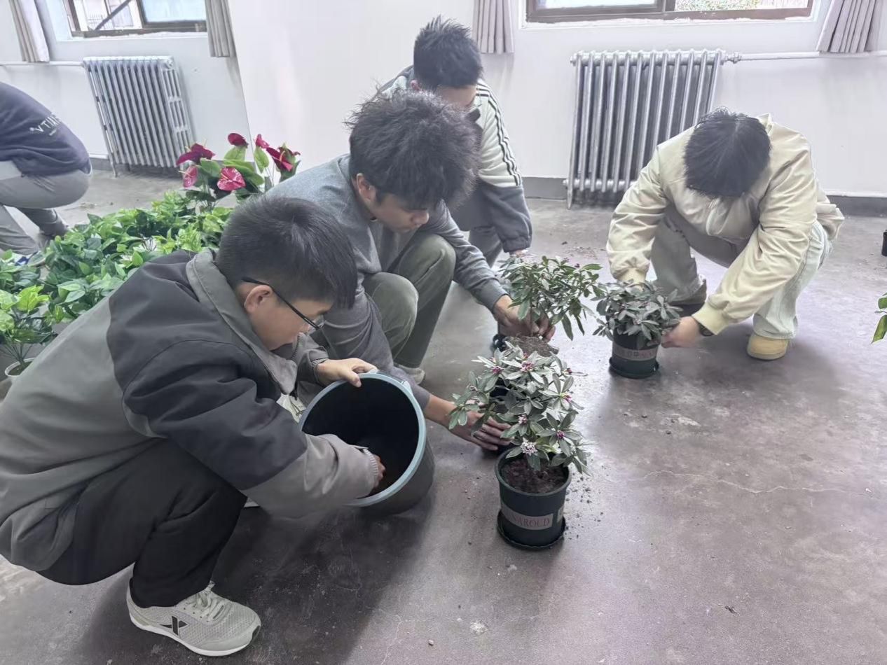 在“以花为媒,共筑心园”活动中,同学们沉浸式体验园艺的独特魅力。从仔细挑选心仪的花苗,到根据植物习性规划盆栽布局,再到轻柔培土、精心修剪枝叶,每一个步骤都饱含专注与耐心。看着原本纤弱的花苗在自己手中扎根入盆,杂乱的枝叶逐渐变得规整有致,成就感油然而生。这不仅是一次园艺实践,更是一场心灵的修行,在与自然的对话中,同学们暂时忘却了喧嚣与焦虑,激发了内心的宁静。