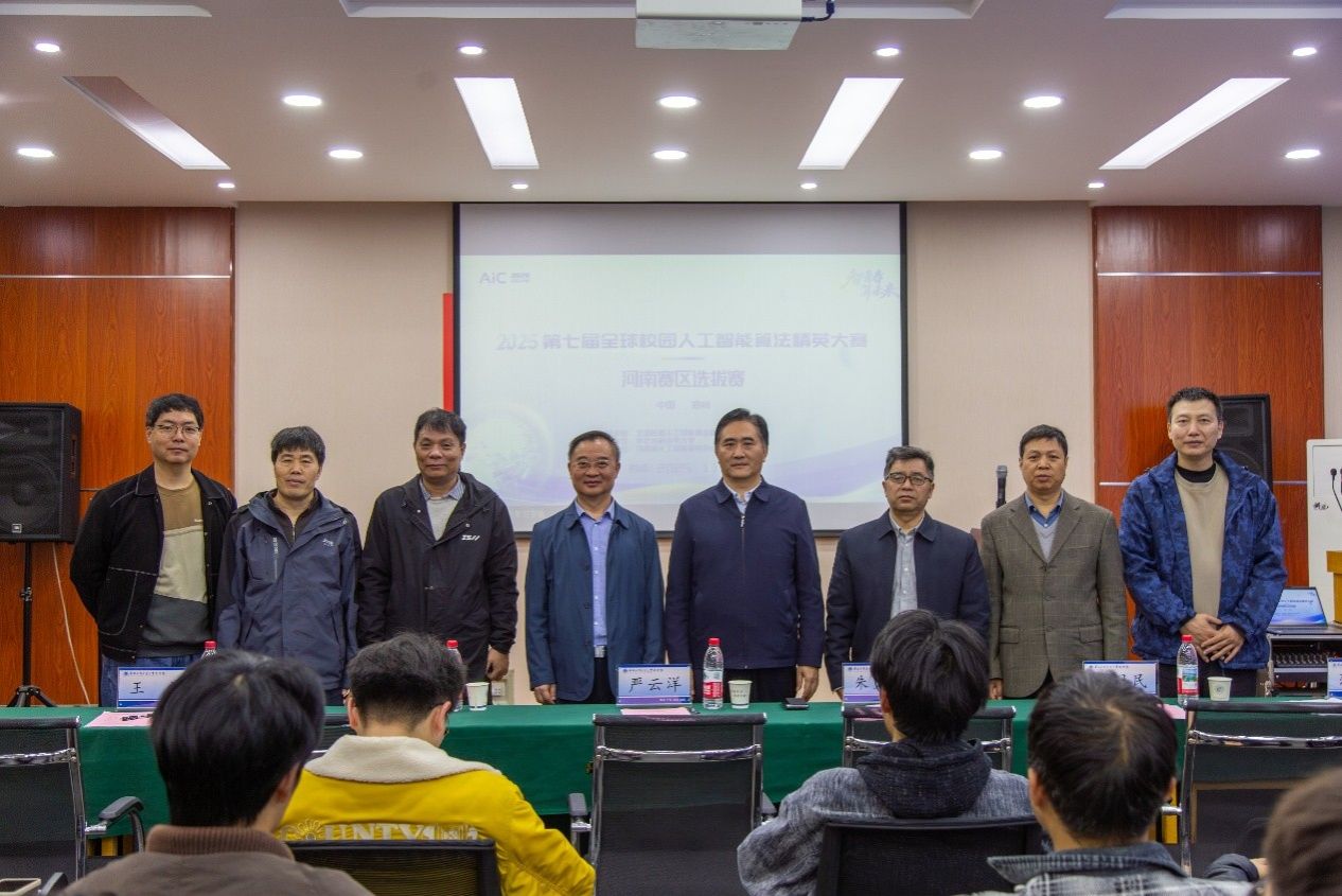 2025年11月8号上午,第七届全球校园人工智能算法精英大赛河南赛区选拔赛开幕式在我校龙子湖校区大学科技园207会议室举行。副校长李彦彬出席开幕式,国赛组委会委派淮阴工学院副校长严云洋莅临省赛现场督查、指导工作,我校工程实践与创新中心、信息工程学院与河南大学、河南职业技术学院等兄弟高校领导参加开幕式,开幕式由工程实践与创新中心副主任范钦栋主持。