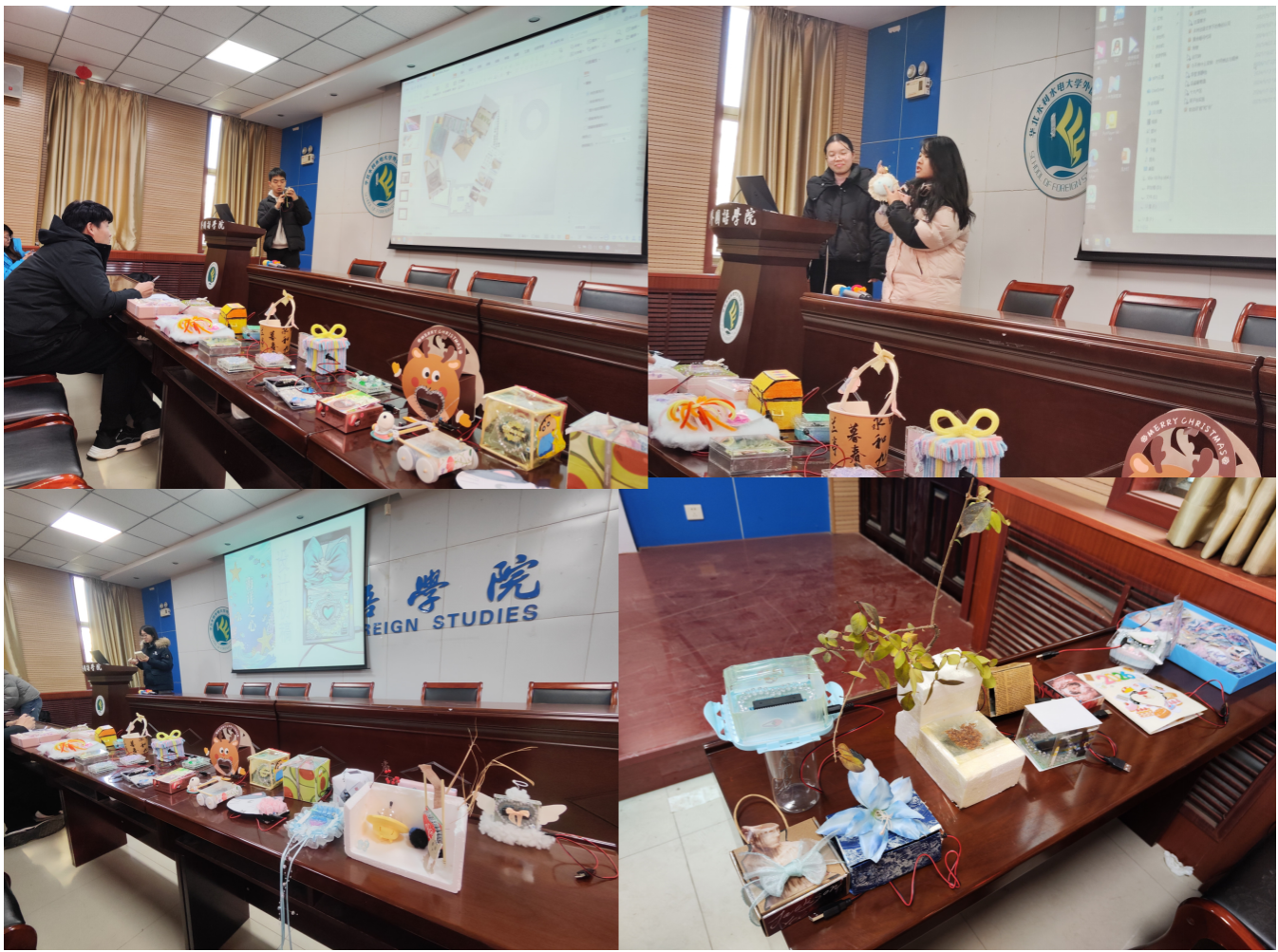 活动自2025年12月起,面向外国语学院的210名本科生开设,引导学生从理论走向实践,践行创新,激发潜能。2026新年伊始,学生创新实践作品路演活动在外国语学院8221室精彩展开,学生分组展示团队精心制作的创新创意流水灯作品。学生利用废旧、闲置材料,结合校园文化、中国风及现代艺术元素,打造出各式各样富有创意的装饰设计。路演现场,学生们生动阐述设计思路和活动心得,在交流互动中互鉴创新理念。
