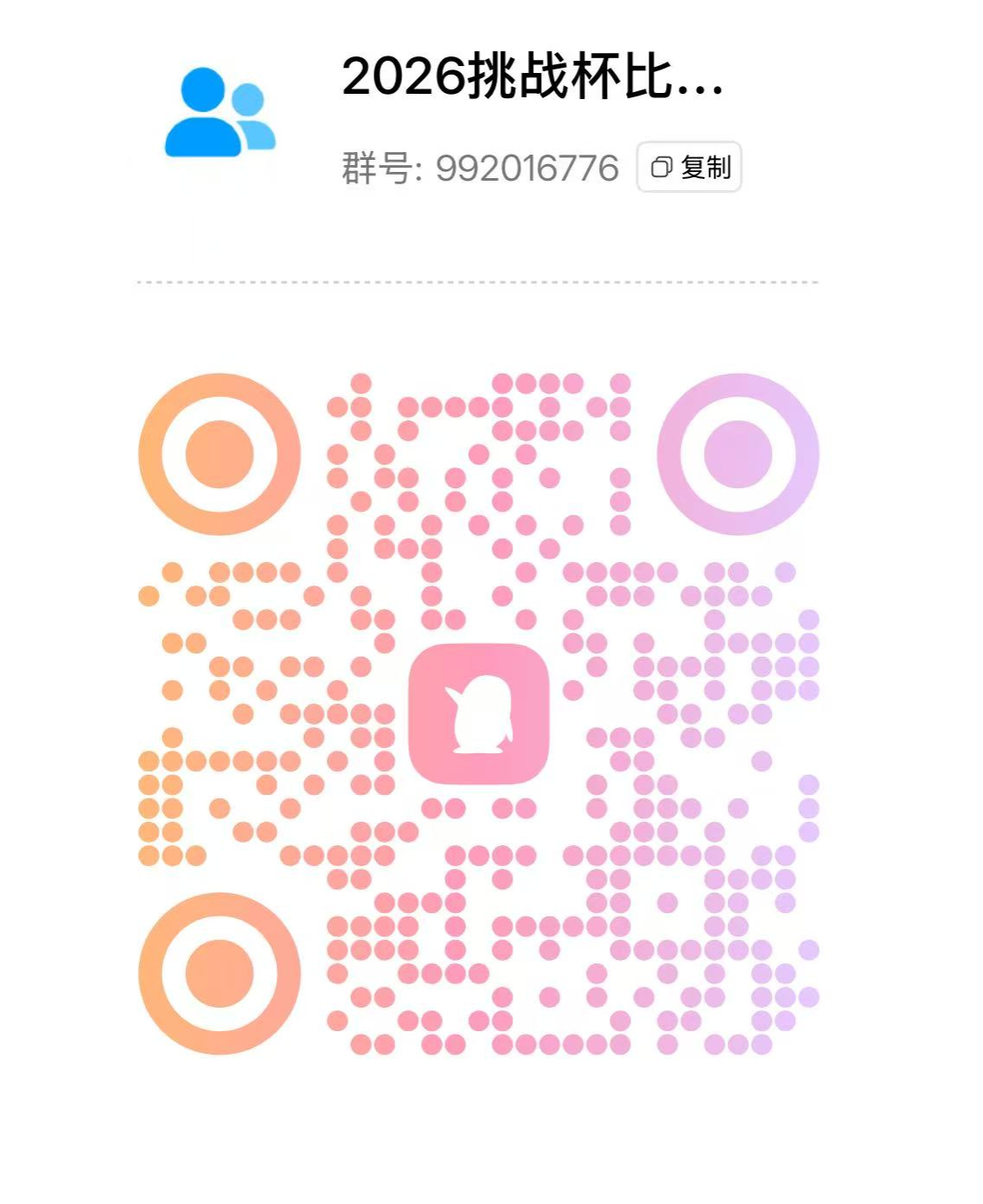 2.请所有相关参赛师生扫码加入挑战杯比赛通知QQ群(群号:992016776),后续比赛相关要求、赛程安排等重要通知将在群内发布,请务必及时关注群内消息。