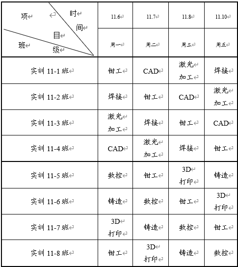 注:(1)CAD、激光加工、3D打印实训地点在花园校区南院水利馆4楼;(2)其他工种实训地点在北院工程训练中心院内。