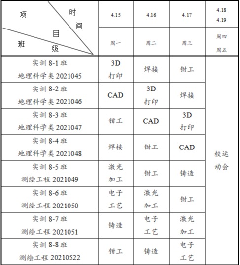 注:(1)CAD、激光加工、3D打印、电子工艺实训地点在花园校区南院工程训练中心4楼;