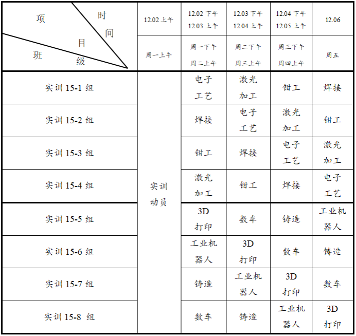 注: (1)3D打印、激光加工、电子工艺实训地点在花园校区南院工程训练中心4楼,工业机器人实训在南院工程训练中心1楼,其他项目实训地点在花园校区北院工程训练中心院内;