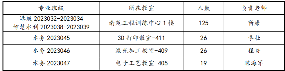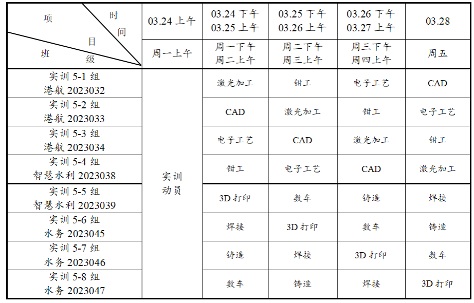 四、实训动员安排:2025年03月24日上午8:00于花园校区南苑工程训练中心进行。人员安排如下。