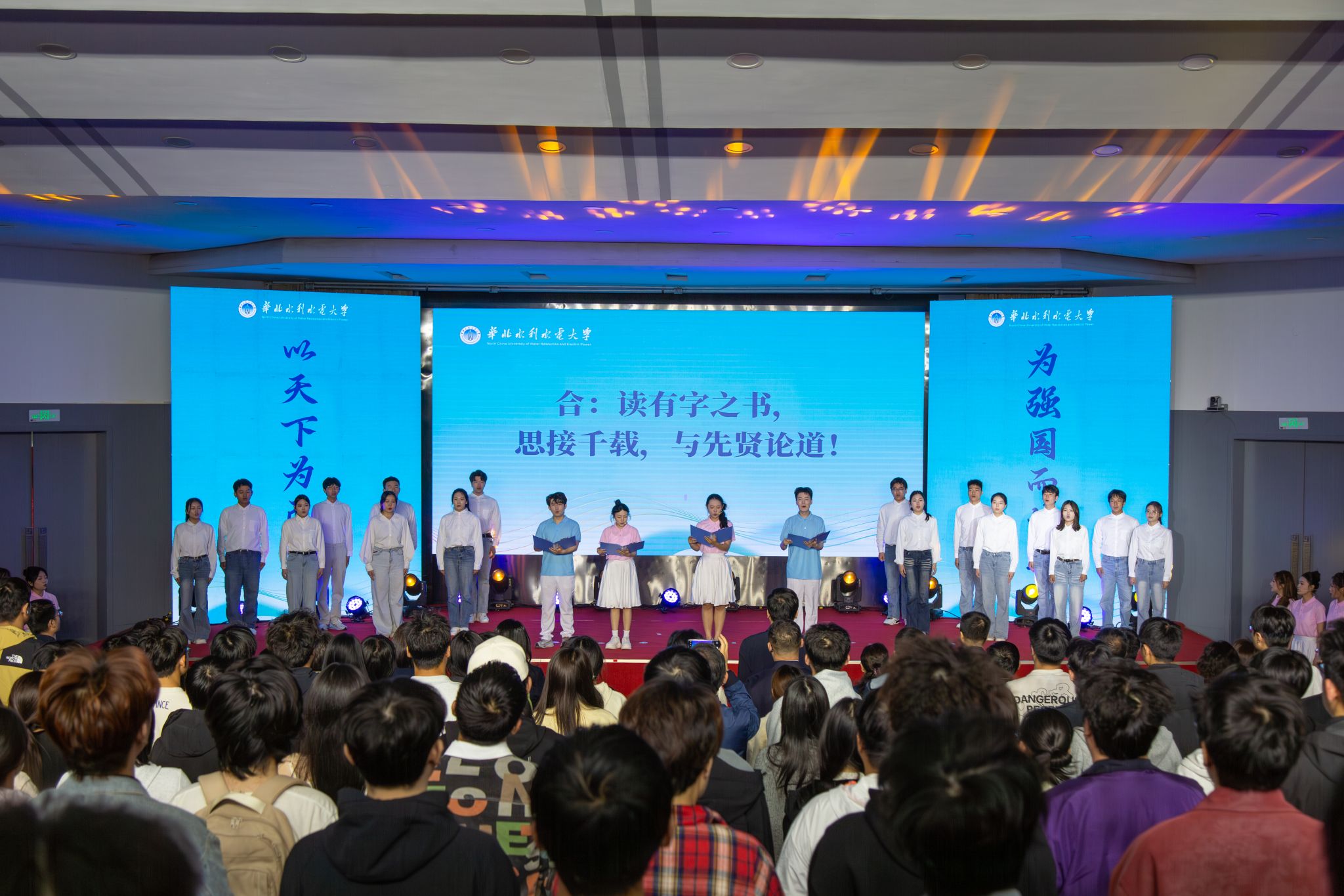 活动在开场视频《为强国而读书》中拉开帷幕。古诗词联诵《回望·历史眼眸》《今朝·意气风发》《来日·风华共绽》串联古今,彰显中华优秀传统文化的深厚底蕴;学生阅读故事分享《在华水读书:一本书如何照亮青春》讲述阅读与成长同行的青春故事;诵读《兰亭集序》在经典吟诵中传递书香之美;研究生支教团带来的《把书读给大山听:支教课堂里的阅读种子》,生动展现了华水青年在基层实践中播撒希望、奉献青春的责任担当;诵读舞蹈《月光下的中国》、教师导读式分享《家国记忆:一对五十年代大学生的时代背影》、诵读《开花》等节目,以多样化形式呈现阅读之美、信仰之光和家国之情;空中连线《在大国重器现场读懂中国》把镜头对准三峡水利枢纽工程,让书本知识与工程实践同频共振;三位不同年代校友带来的《从书斋到岗位:在强国征程中展现华水人的风采》,深情讲述了华水人把个人理想融入国家需要、在报国征程中实干担当的奋斗故事。华水校友、著名科幻作家刘慈欣视频寄语青年学子,既要埋头读书,也要仰望星空;既要读懂中国,也要创造未来。师生合诵《春》,以昂扬蓬勃的精神风貌将整场活动推向高潮。
