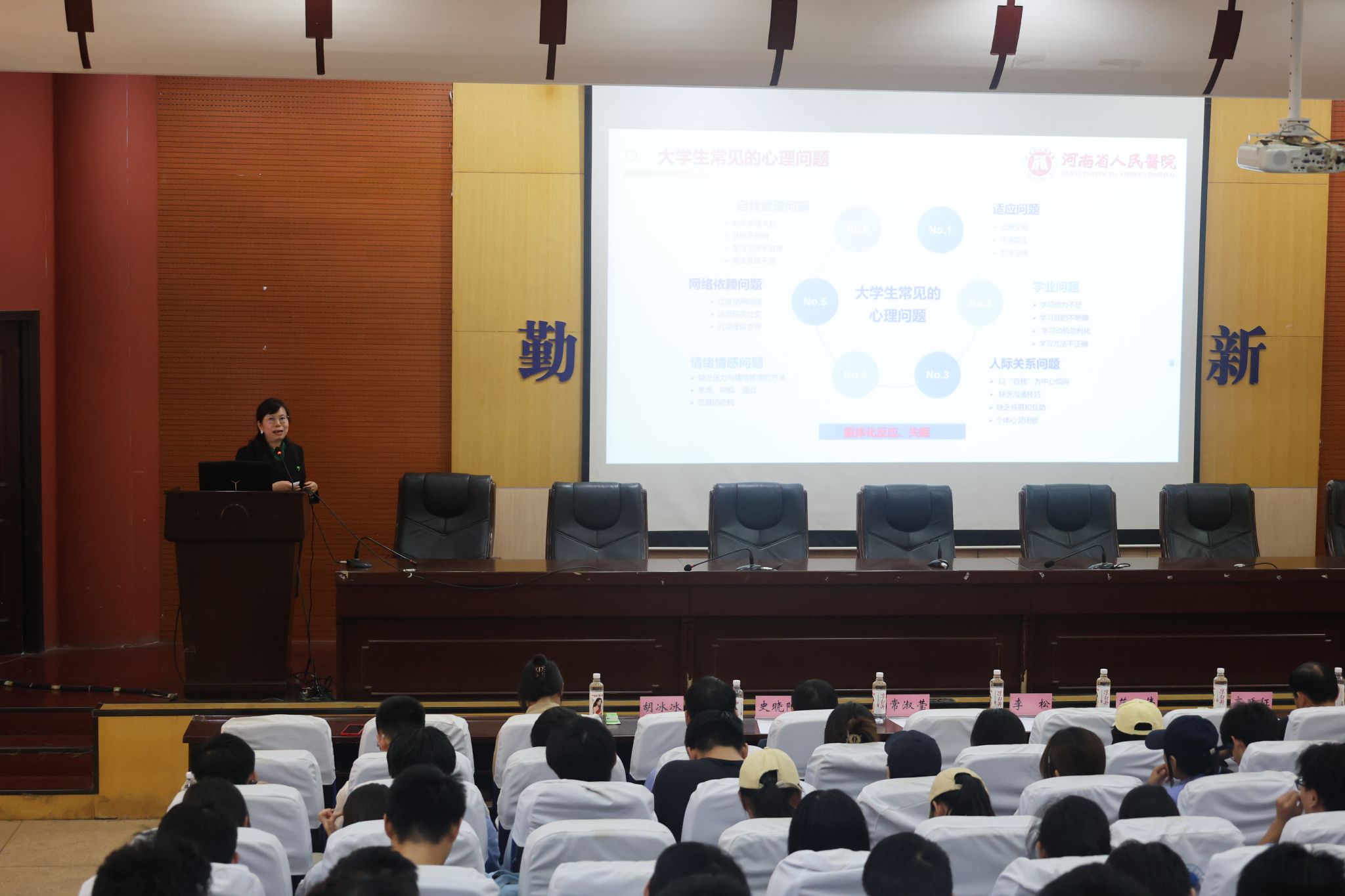 河南省人民医院临床心理治疗师、清华大学积极心理学指导师常淑莹以《青春正当好扬帆》为题,从认识自我开题,结合一分钟击掌频率认知,帮助大学生切实做到“我爱我”,更好地爱自己。在自我形象与心理健康知识环节,她向同学们介绍了高自我形象、低自我形象和大学生心理健康的标准,鼓励学生正确面对心理健康问题,积极主动寻求帮助,优化自我人生。