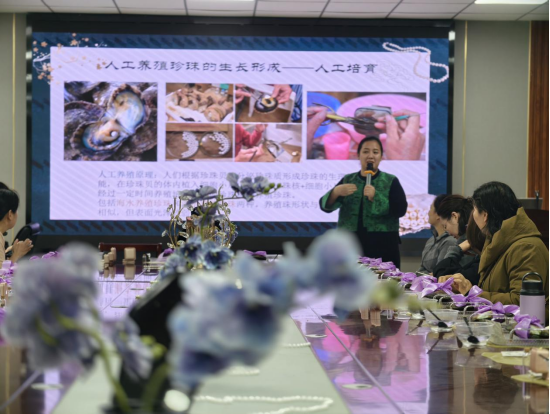 活动伊始,专业手工艺讲师向大家介绍了珍珠的形成原理、养殖历史以及开蚌、取珠、抛光、加工成饰品的完整流程。在讲师生动有趣的讲解中,老师们对这项充满未知与惊喜的活动产生了浓厚的兴趣。