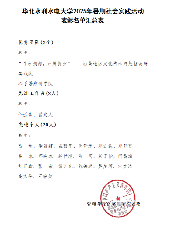 管理与经济学院2025年暑期社会实践表彰名单公示