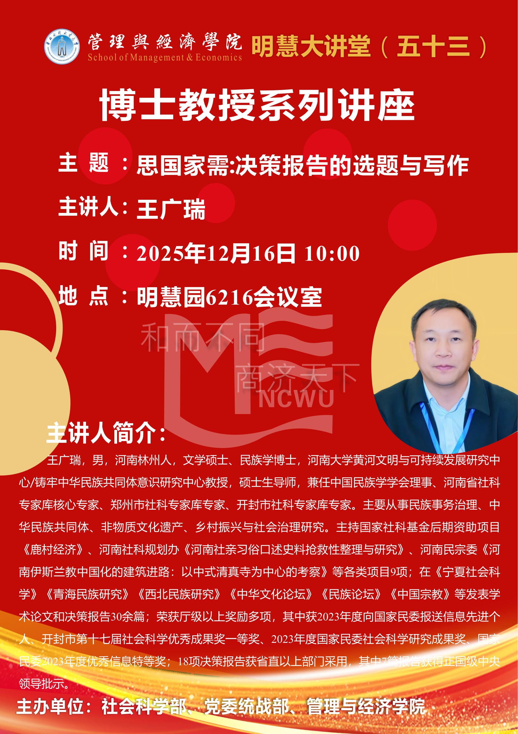 为深入推进学术研究与国家战略需求紧密结合,切实提升师生决策咨询报告的选题精准度与写作实操能力,学院联合社会科学部、党委统战部拟开展“明慧大讲堂(五十三)博士教授系列讲座”活动,现将具体安排通知如下: