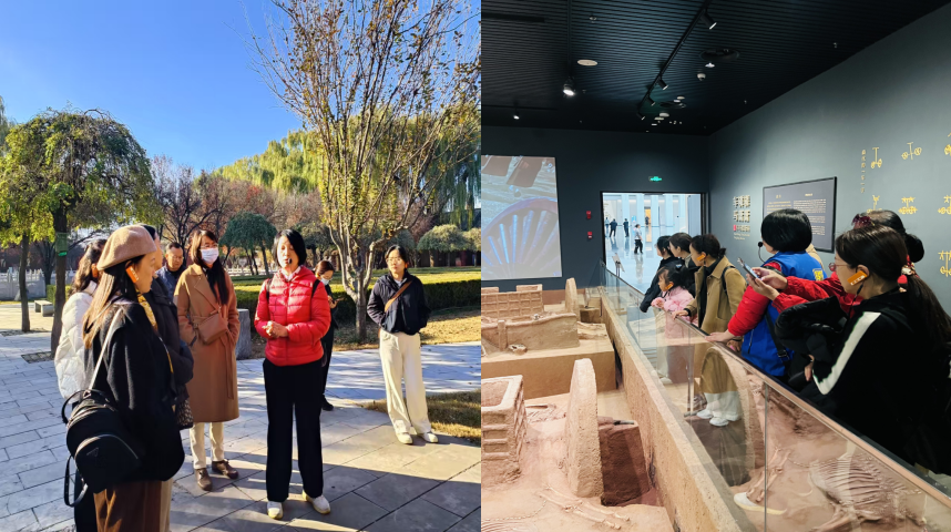 午后,老师们乘车前往殷墟遗址公园。在宫殿宗庙遗址区,大家驻足于复原的商代宫殿基址前,想象三千年前商王在此处理政务、祭祀祖先的场景;在甲骨文碑林前,老师们仔细辨认刻在石碑上的卜辞内容,尝试解读先民对自然、战争、祭祀的记录;而在妇好墓展区,讲解员讲述的商代女将妇好“带兵征战、主持祭祀”的传奇人生,让老师们对古代女性的智慧与担当有了新的认识。
