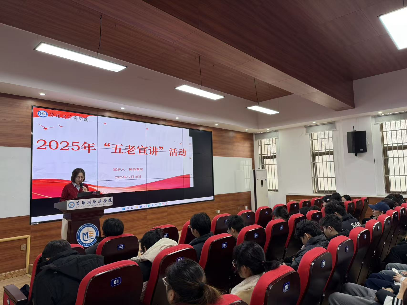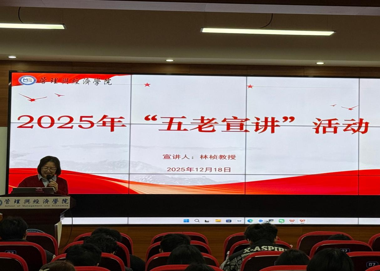 12月18日下午,管理与经济学院在6112报告厅举行“五老宣讲”报告会。河南省教科文卫体“最美教师”、学校“五老宣讲团”成员林桢教授以“拓宽生命维度,做不设限的自己”为主题,为学院青年学子带来了一场兼具温度与力量的成长分享。学院120名学生参加报告会。会议由学院党委副书记于海丽主持。